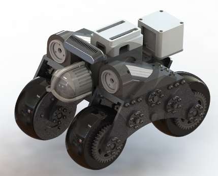 国内首台能自适应水电站叶轮等正负曲率交错曲面的攀爬移动机器人。它采用多自由度磁性球轮,内置哈尔贝克磁铁阵列,可紧密吸附于复杂曲面。中心差速结构确保检测探头在移动中始终垂直于表面,保障检测精度与稳定性。通过球轮与悬臂的配合,实现四轮在交错曲面上的稳定接触与安全移动。其搭载的7组探头可进行大跨度同步探测,扫描跨度达200mm,显著提升了检测效率。整体结构紧凑,兼具传动可靠与功能扩展能力。