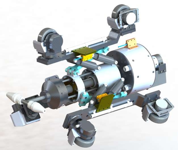 机器人采用自适应悬挂机构,能适应DN500-700管径变化并稳定越障。搭载9组全驱电机,实现360°转向,在直管、弯管及垂直段均运动灵活。集成位姿补偿、高压水清洗及喷涂功能,支持超过40米距离的实时控制与无延时视频回传,实现高效管道维护。